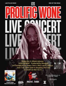 About Prolific Wone: Prolific Wone is a multidisciplinary artist merging Hip-Hop, poetry, and visual storytelling. A veteran of NYC’s underground creative scene, and co-founder of global Hip Hop community and MC Challenge, End of the Weak, he has earned acclaim for his lyrical depth and cinematic approach to independent music.