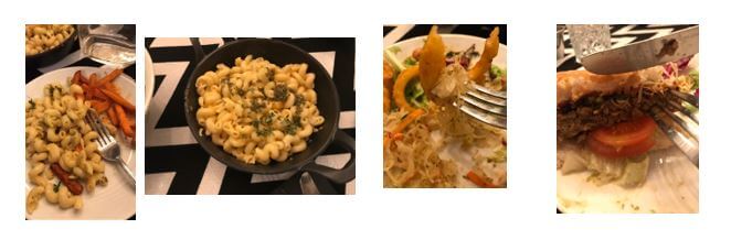 (From Left to Right – mac + cheese and sweet potatoes? Carbs upon carbssssss – Mac + Cheese – Curly fries and sauerkraut (because balance) – Tasty burger with sprouts )